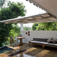 A pesar de tener un ventanal en la mayor parte, la recámara principal se aísla de la pérgola con una marimba de teca que permite la entrada de luz entre el follaje de los cerezos. El deck conformado por una jardinera hecha a base de placa de acero curva es el perfecto espacio para pasar una tarde rodeado de olivos.